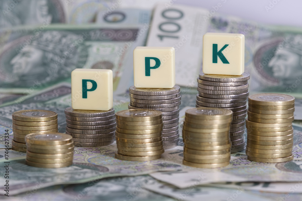 PPK, Pracownicze Plany Kapitalowe, letters on polish zloty coins, banknotes. PPK is a Employee Capital Plans private savings retirement plan in Poland contributed to by the employer and the state.