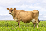 Jersey cow side view, in a green pasture, Jersey cattle, black nose brown coat, large udder