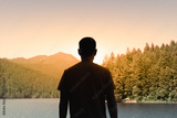 Traveler Young Man Looking Out to Beautiful Golden Sunrise Enjoying View of Nature Mountains, Forest, and Lake