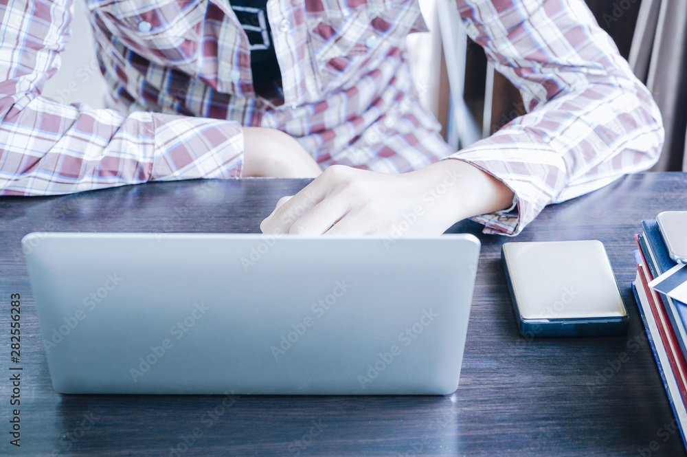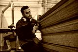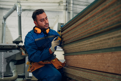 Contemporary Carpenter Working in factory, operating modern machines. Portrait of modern carpenter making wood furniture at industrial job site.