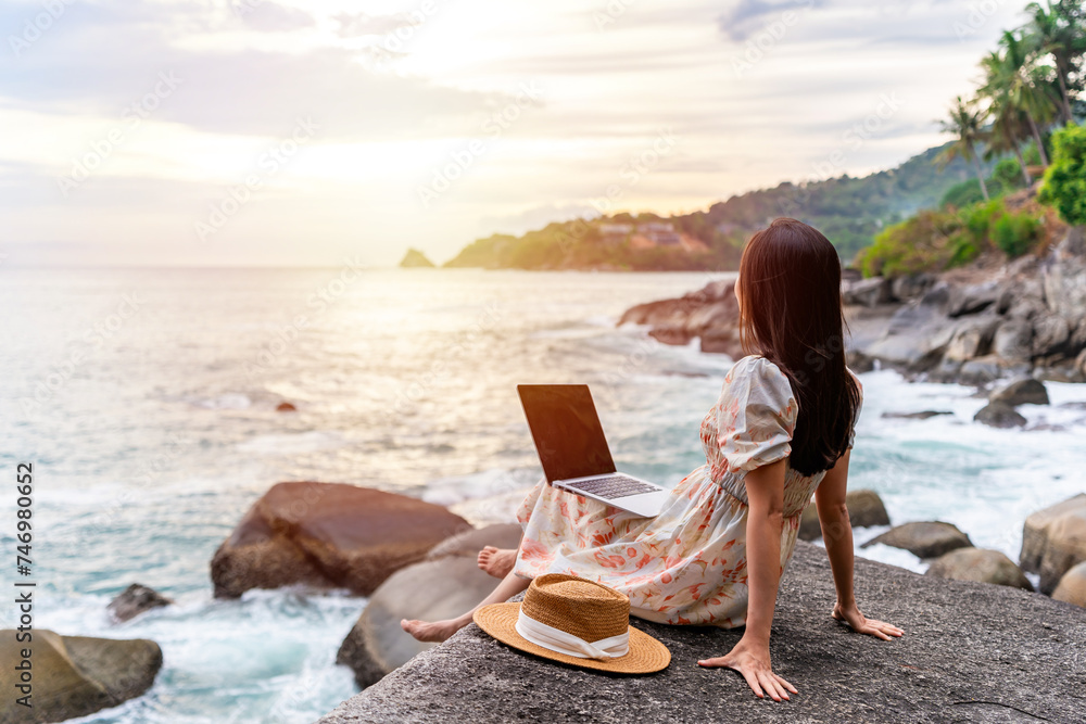 Young woman freelancer traveler working online using laptop while traveling on summer vacation, Freelance and workation concept