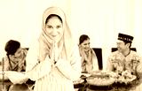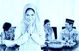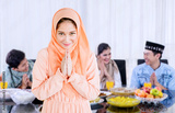 Smiling young Asian Muslim woman gesturing Eid Mubarak greeting at home