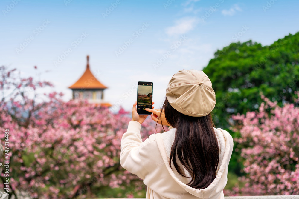 Young female tourist taking a photo of the beautiful cherry blossom at Wuji Tianyuan temple in Taiwan