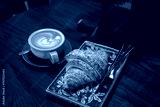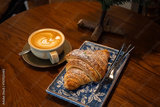 Hot coffee latte with latte art milk foam in cup mug with Croissant on wood desk on top view. As breakfast In a coffee shop at the cafe,during business work concept,vintage style