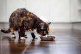 Cute hungry tabby cat eating from metal bowl at home in kitchen. Domestic life with pet..
