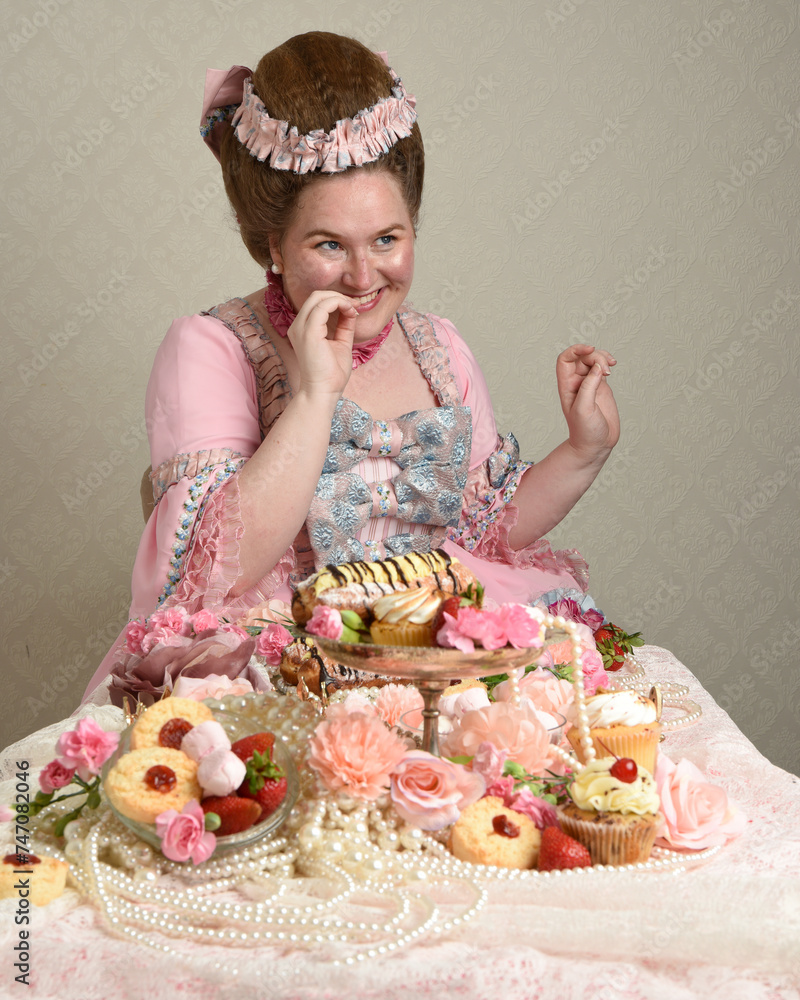 Close up portrait of cute female model wearing an opulent pink gown, the costume of a historical French baroque nobility. sitting table with sweet cakes and indulgent food feast.