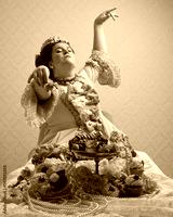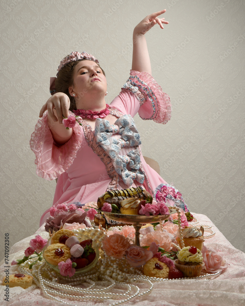 Close up portrait of cute female model wearing an opulent pink gown, the costume of a historical French baroque nobility. sitting at table with sweet cakes and indulgent food feast.