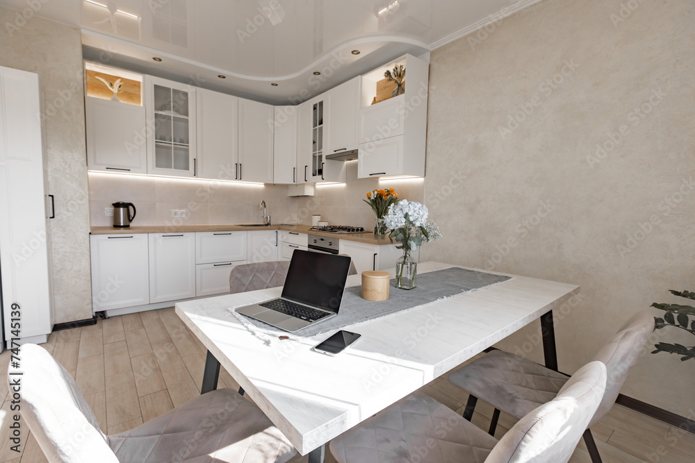 a modern white kitchen interior with wooden worktop
