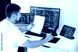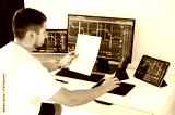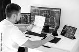 Male trader sits in his home office in front of screens with graphs and financial charts, predicts, analyzing and studying the growth or decline of cryptocurrency. Stock exchange, trading