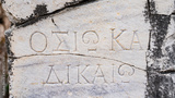 Close-up background of ancient Greek writings on the ruins of an ancient city