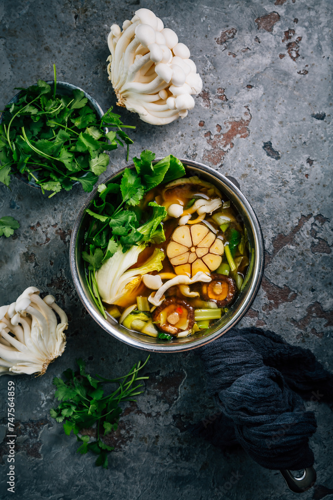 Beef and miso garlic broth, soup with vegetables, mushrooms and cilantro