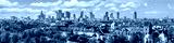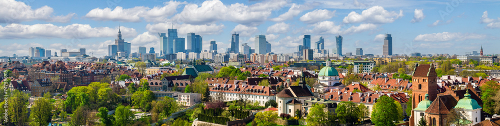 Warsaw old town and distant city center, PKiN and skyline under blue cloudy sky aerial landscape