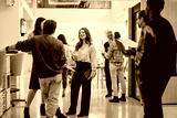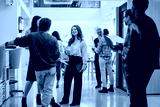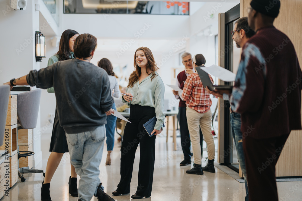 Businesspeople in a modern office space are engaging in a relaxed, informal networking session, exuding a friendly and collaborative atmosphere.