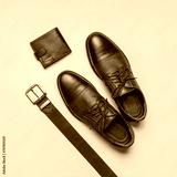 Men's accessories on beige background. Leather brown classic shoes, wallet and belt. Casual design, fashion concept. Flat lay, top view