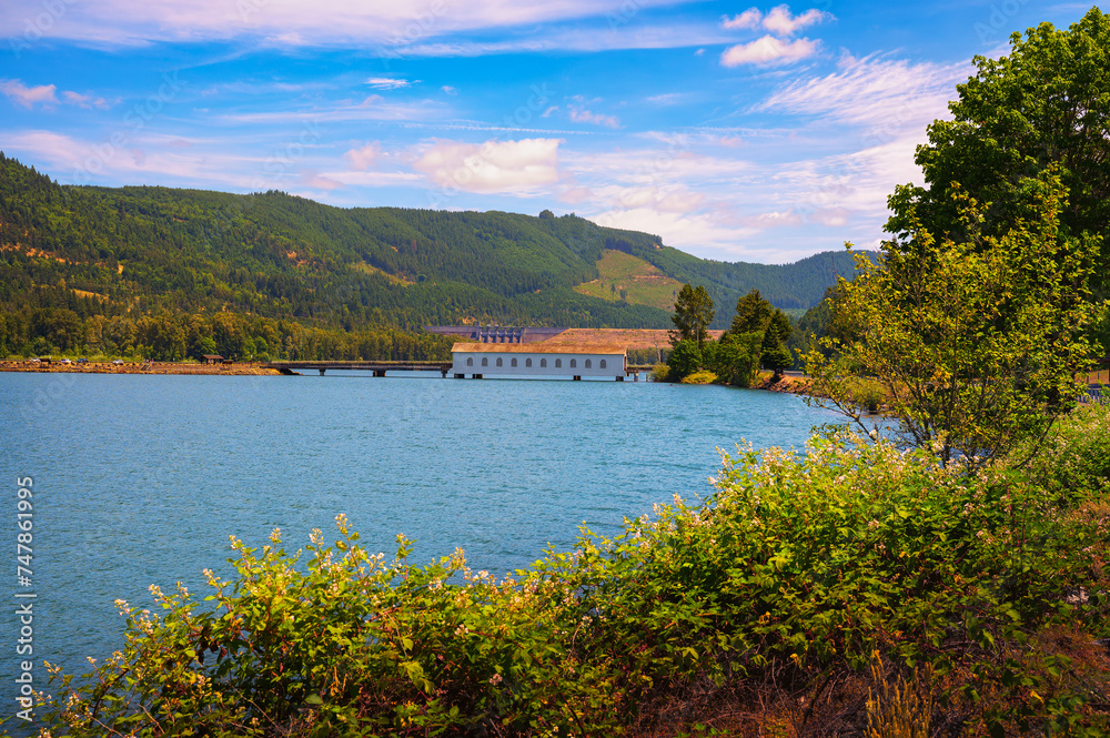 Dexter Reservoir with Lowell Covered Bridge, Oregon, surrounded by lush forest. Dexter Reservoir, also known as Dexter Lake, is a reservoir in Lane County formed on the Middle Fork Willamette River.