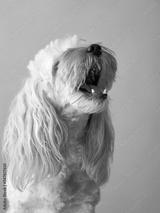 A Havanese dog mid-yawn, its wispy beige fur contrasting with a light blue background, exudes a sense of contentedness