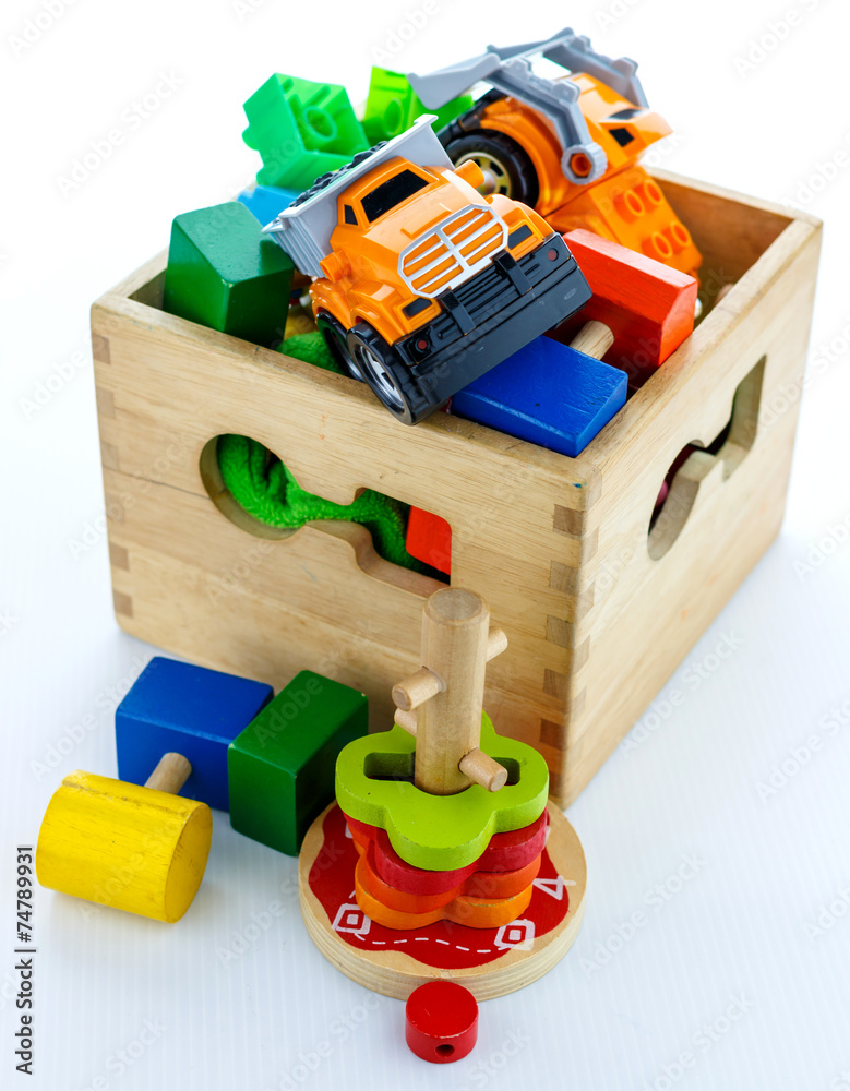 A bright and colorful collection of wooden and plastic toy cars for kids displayed on a white background, perfect for imaginative play and fun.