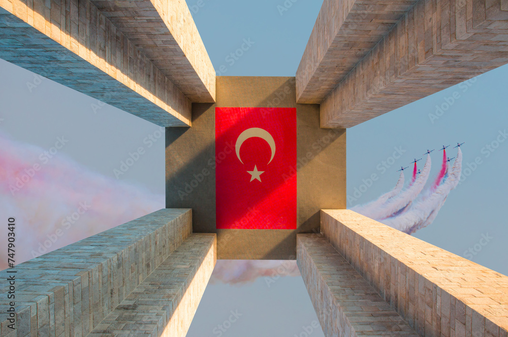 Air Force aerobatic team performing demonstration flight over Canakkale Martyrs' Memorial against to Dardanelles Strait - (Çanakkale) Canakkale, Turkey
