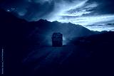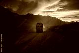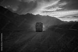 Cargo truck on the mountain road in Ladakh during sunset