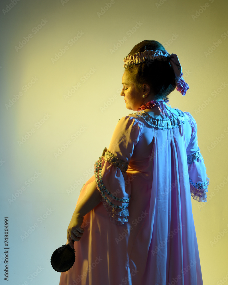 cinematic portrait of female model wearing an opulent pink gown, costume of a historical French baroque nobility, style of Marie Antoinette. Holding hand mirror, Isolated on studio background.