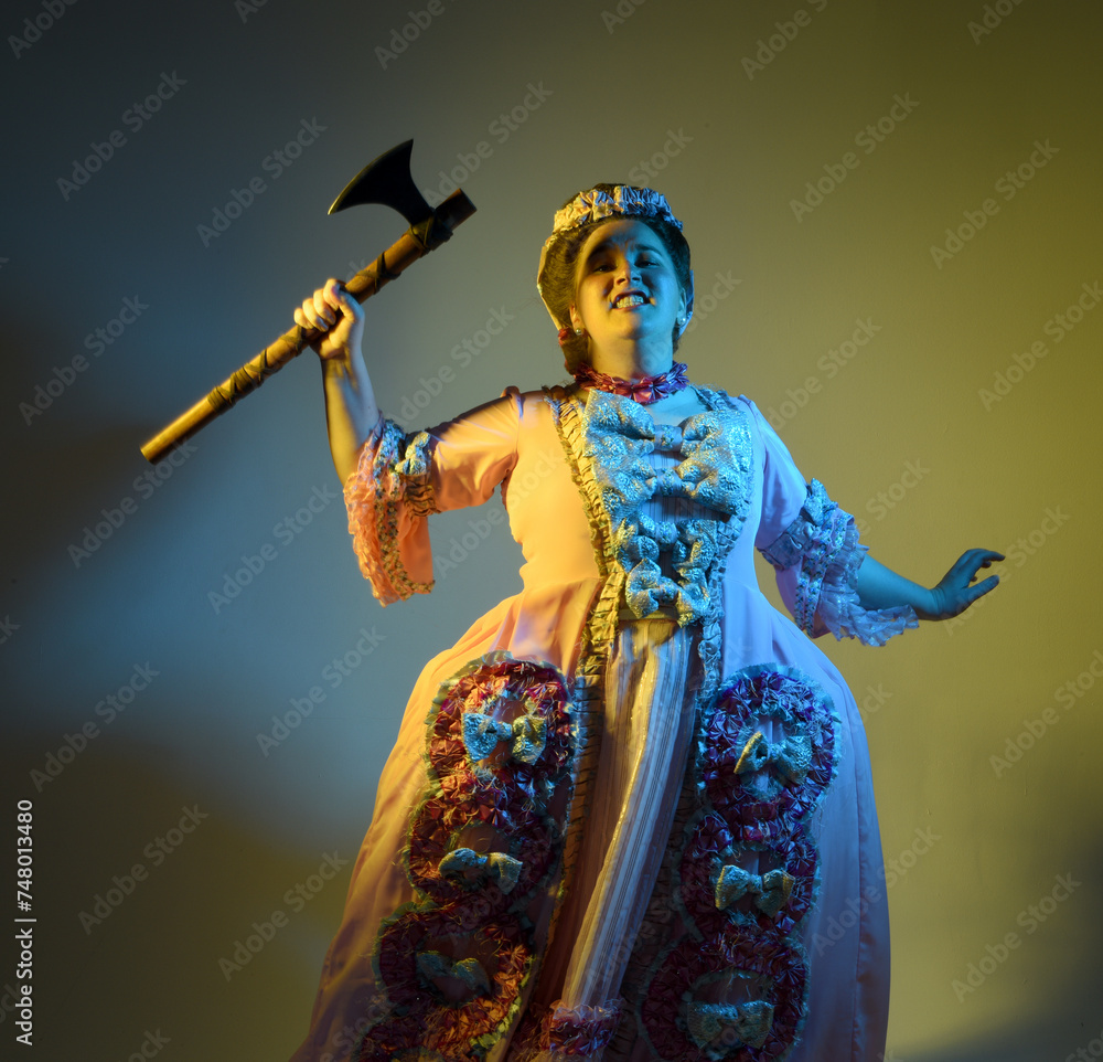 portrait of female model wearing opulent pink gown, costume of a historical French baroque nobility, style of Marie Antoinette. holding axe weapon in revolutionary attacking pose. studio background