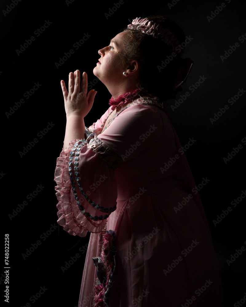 close upProfile portrait of female model wearing an opulent pink gown, costume of a historical French baroque nobility, style of Marie Antoinette. Isolated dark cinematic silhouette studio background