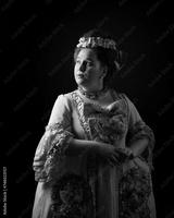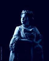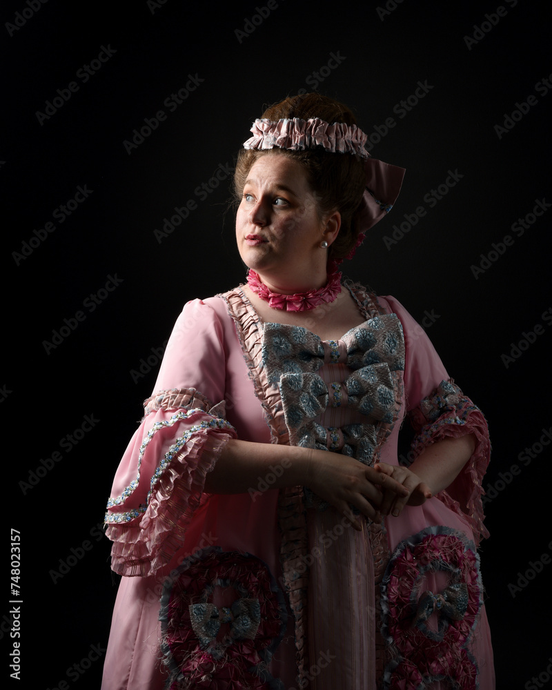 close upProfile portrait of female model wearing an opulent pink gown, costume of a historical French baroque nobility, style of Marie Antoinette. Isolated dark cinematic silhouette studio background