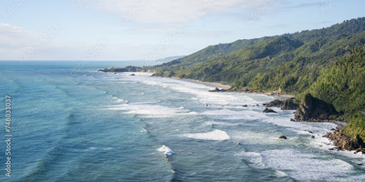 Rough exotic coast with azure ocean water, big waves and rainforest vegetation, New Zealand