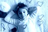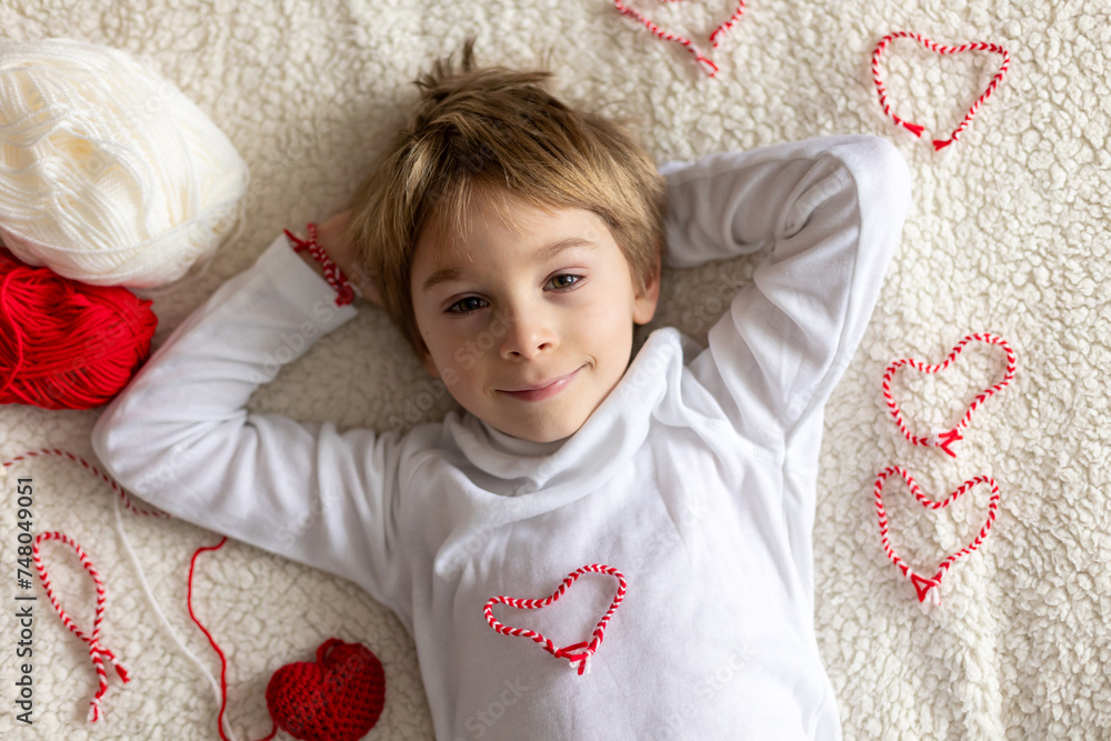 Cute child, blond boy, playing with white and red bracelet, martenitsa