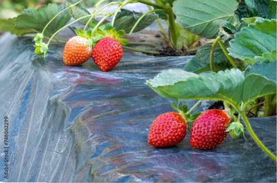 Ripe red strawberries on a bush. Organic strawberries in the garden.