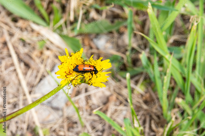 An abscess beetle on a dandelion. A beetle eats a flower.