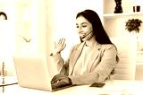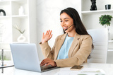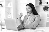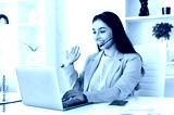Video consultation. Successful positive arabian or indian young woman, call center operator with headset, working on support help desk in the office with a laptop, smiling. Customer support service