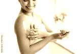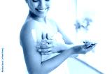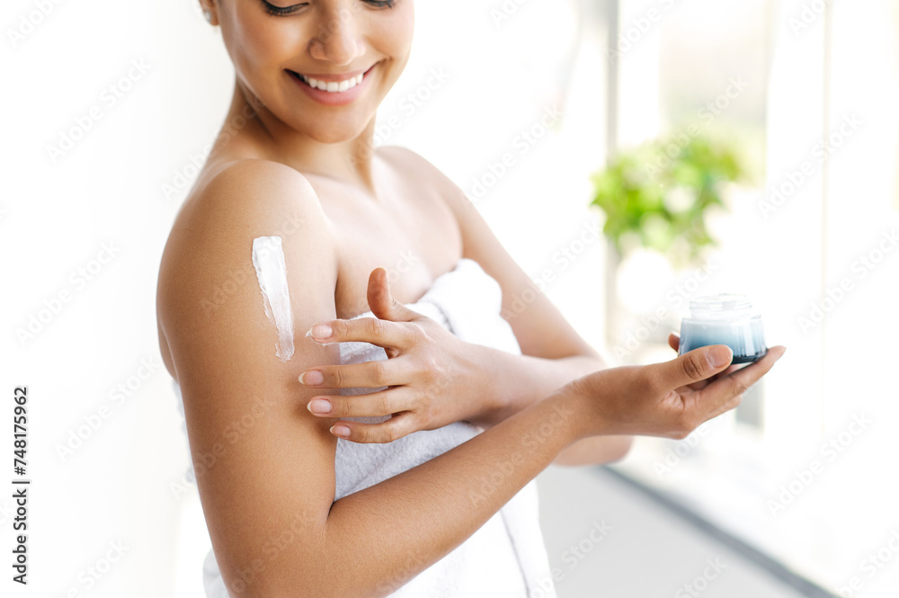 Body skin care routine concept. Close-up view hands of a young hispanic or brazilian woman wrapped in a white towel, applying moisturizing cream on the shoulder, smiling