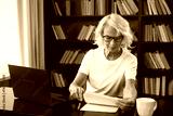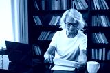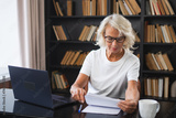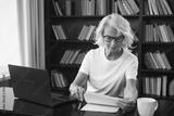 Confident stylish middle aged senior woman using laptop at workplace. Older mature lady businesswoman sitting at office table with laptop and paper document. Boss leader teacher professional worker