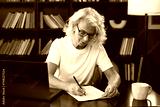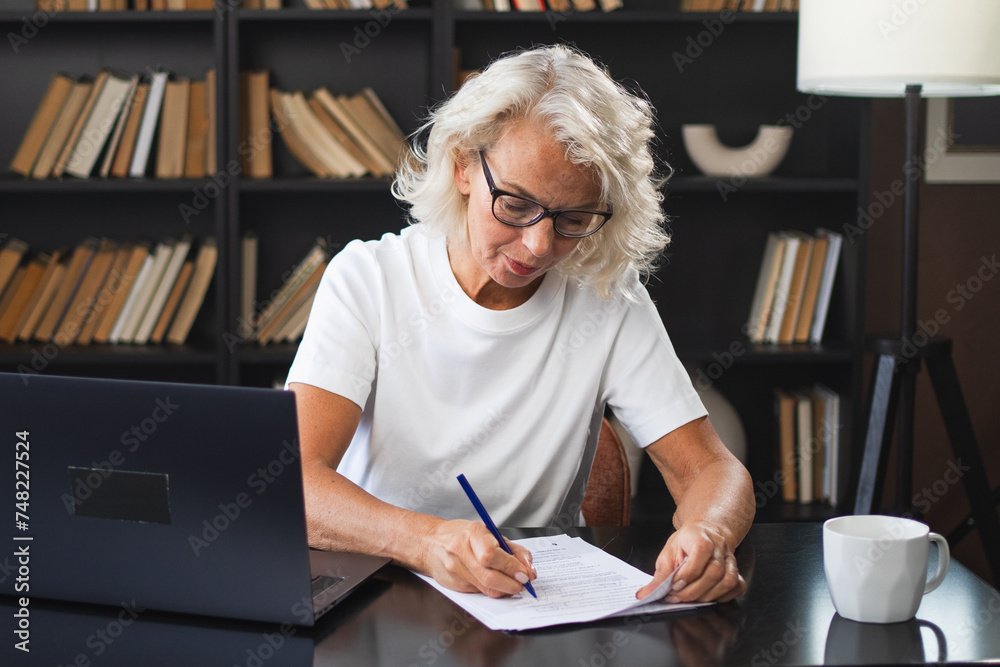 Middle aged senior woman using laptop computer writing notes at workplace. Focused mature old businesswoman work at office making written records doing online work. Mature boss professional worker