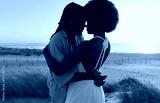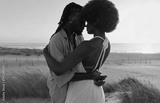 Happy black couple standing and embracing on sand with dry grass plants