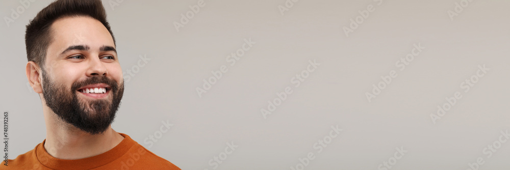 Man with clean teeth smiling on grey background, space for text. Banner design