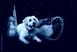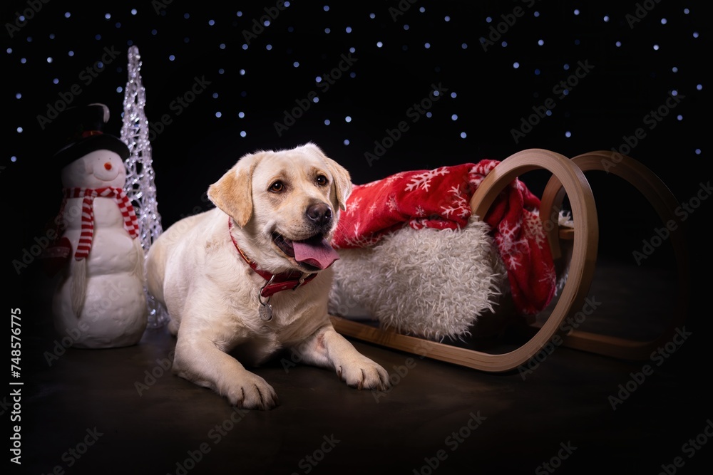 Happy dog in Christmas studio. Beautiful and cute dog portrait on dark background with Christmas atmosphere. Pet photography in studio.