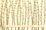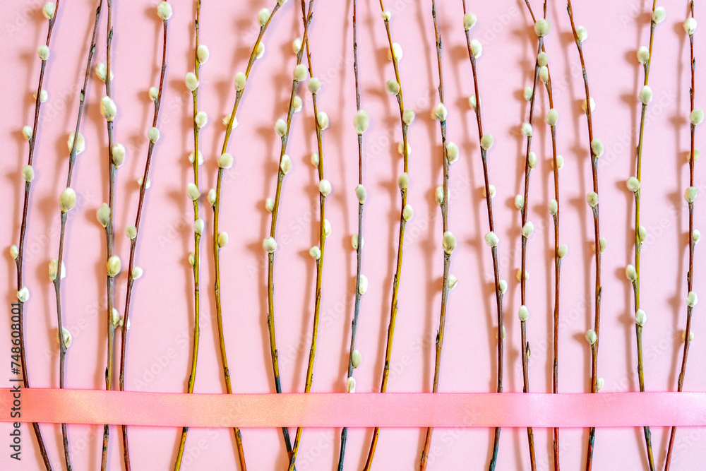 Easter composition in minimal style made of pussy willow branches with catkins and pink ribbon on pink pastel background. Happy Easter, Palm Sunday concept. Flat lay, top view, copy space, mock up