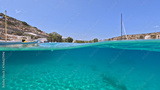 Underwater split photo of traditional fishing wooden boats in port of Iraklia island, small Cyclades, Greece