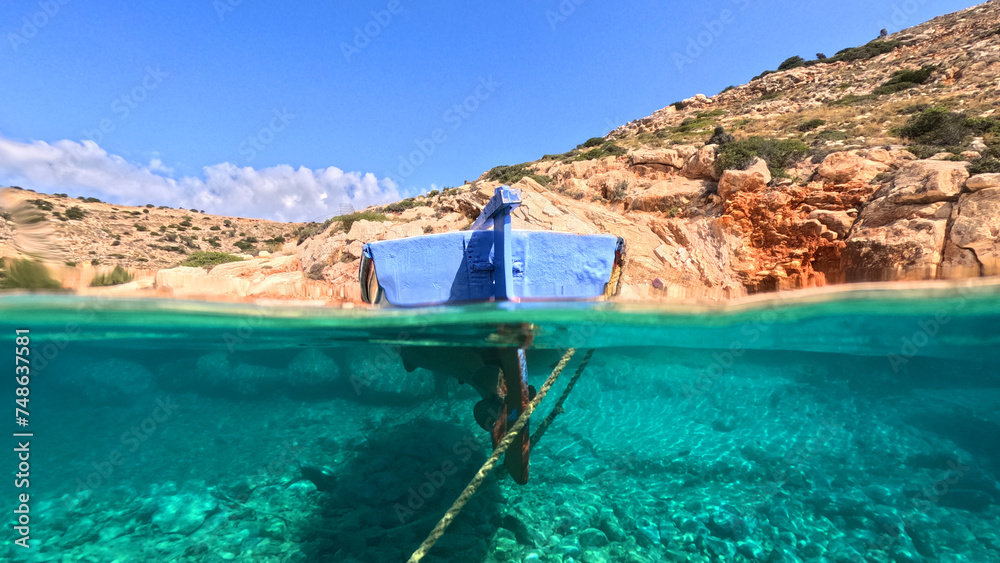 Underwater split photo of traditional wooden fishing boat anchored in turquoise sea of rocky bay in island of Crete, Greece