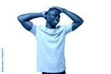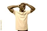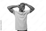 a young authentic american guy dressed in a light lilac t-shirt is confident in himself on a white background