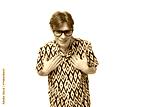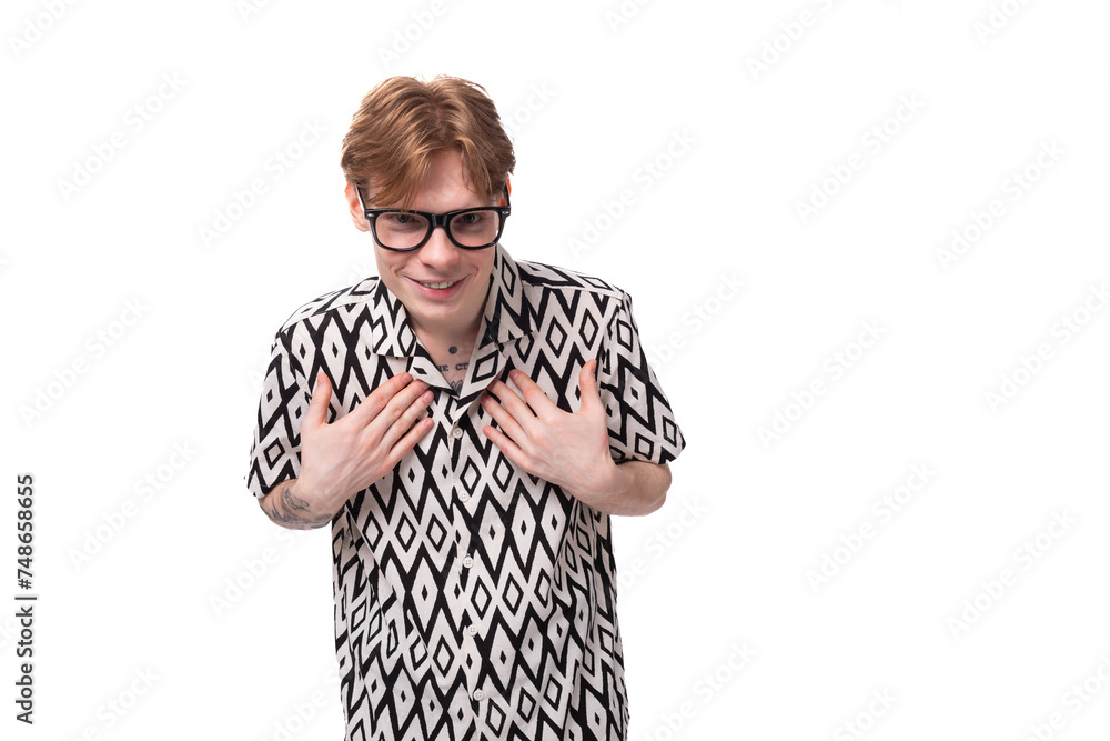 young surprised red-haired guy in glasses dressed in a summer shirt on the background with copy space