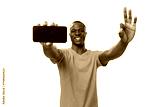 young american man experiencing joy and happiness demonstrating smartphone screen with mockup on white background with copy space
