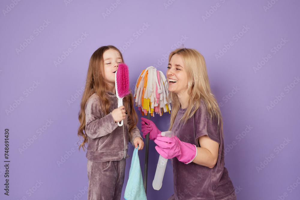 A beautiful young woman and her little cheerful daughter are cleaning the house. are holding cleaning products and smiling, the concept of cleanliness