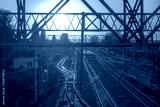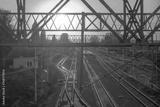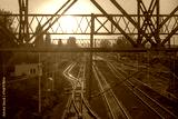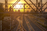Kolorowy zachód słońca nad torami kolejowymi w Ostrowcu. Konstrukcje metalowe i tory kolejowe zanurzone w złotych promieniach zachodzącego słońca w majowy wieczór.