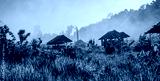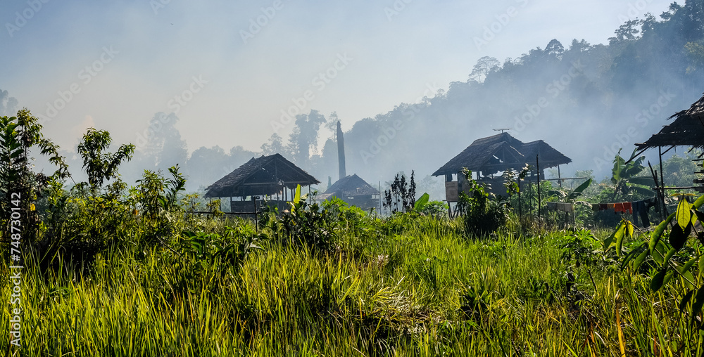 Huts on stilts inhabited by the Wana people stand among the tall grass of the Morowali Reserve, in Central Sulawesi