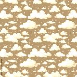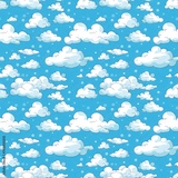 A playful, whimsical pattern of cartoon-style clouds and stars on blue backdrop