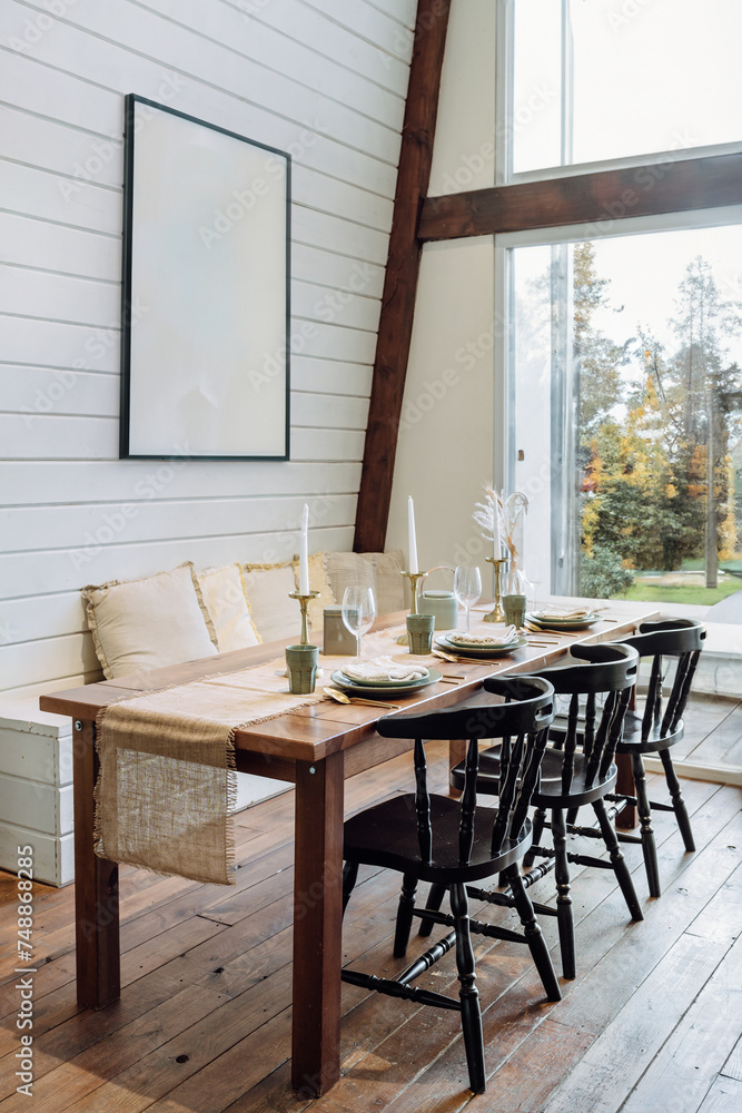 Setting table in dining room, chairs, plates, wine glass and candles