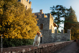 A Jack Russell Terrier dog stands on an ancient stone wall, with a historic castle and golden foliage in the background.